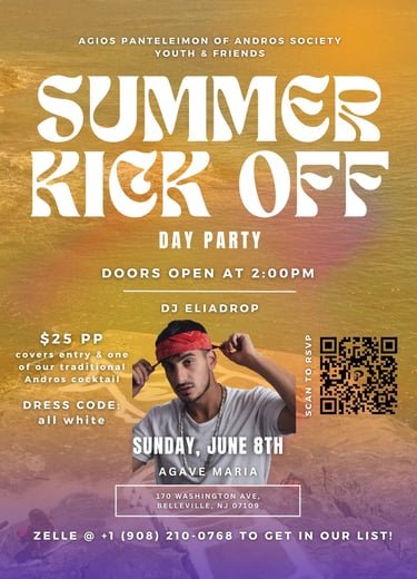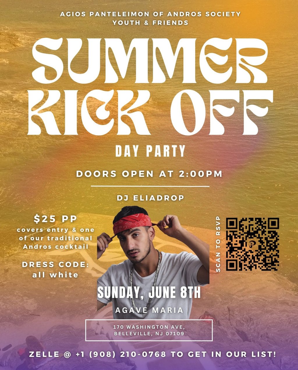 calling all greek youth & friends to party with @djeliadrop! Get ready to dance, dive, and vibe at our Annual Summer Kick Off Party hosted by Agios Panteleimon of Andros Society! Dress code - wear white! music, memories, and more —don't miss the summer start we've all been waiting for.